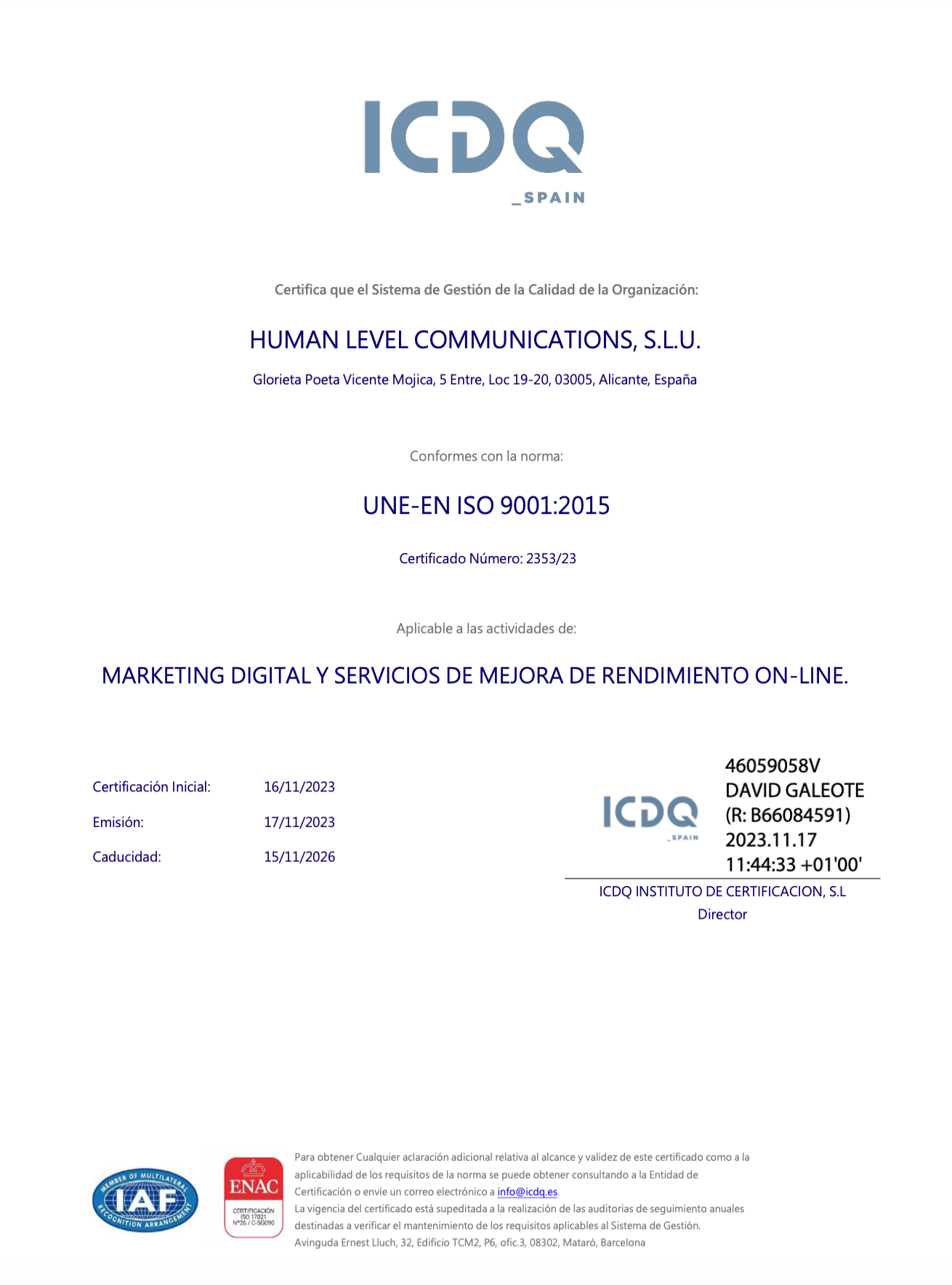 ICDQ, entidad certificadora de sistemas de gestión de empresas, certifica que nuestro Sistema de Gestión de la Calidad está conforme con la norma UNE-EN ISO 9001:2015, aplicable a las actividades de marketing digital y servicios de mejora de rendimiento online que ofrecemos a nuestros clientes. A continuación puedes ver nuestro certificado: